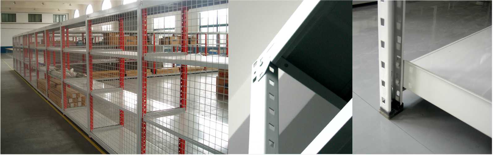 主要部件為冷板鈑金而成,可以按50mm步距自由上下調(diào)整,為便于人工存取貨物,貨架總高度最多可達(dá)3米。可單獨(dú)使用,也可自由拼接成各種排列形式。